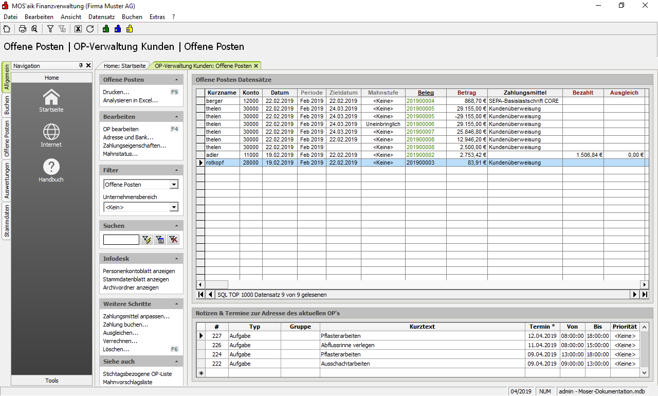 Weitere Informationen finden Sie in der Beschreibung des Erweiterungsmoduls OP & Mahnwesen im Handbuch Finanzverwaltung sowie unter Abschnitt 4.7.2, „Buchen von Zahlungen (mit Finanzverwaltung)“.