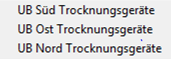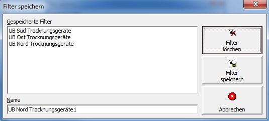 Mit dieser Schaltfläche kann die gespeicherte Einstellung geladen werden. Im Beispiel sind für verschiedene Unternehmensbereiche Trocknungsgeräte als Filter gespeichert.