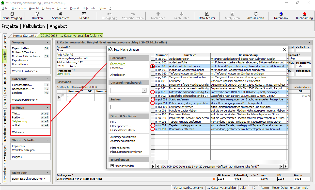 Alternativ können Sie auch eine Spalte durch Anklicken der Spaltenüberschrift auswählen und anschließend durch einfaches "Vortippen" von Text mit Ihrer Tastatur darin suchen. Die Suchergebnisse werden direkt angezeigt. So wurde im Beispiel in der Liste der Sets durch Vortippen von "e-" die angezeigte Liste auf die Artikelnummern für Elektroarbeiten reduziert.