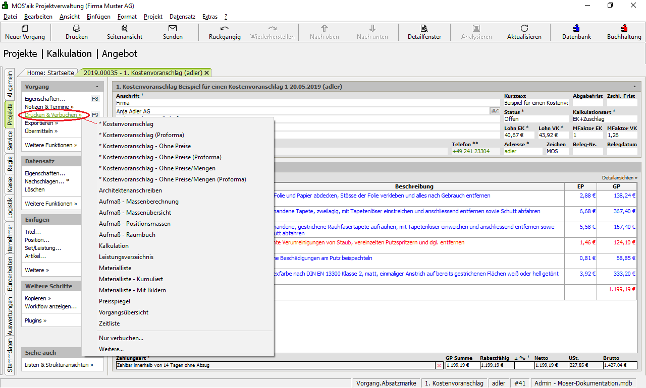 Abschließend können Sie nun den Kostenvoranschlag mit der Funktion Drucken & Verbuchen für Ihren Kunden ausdrucken.