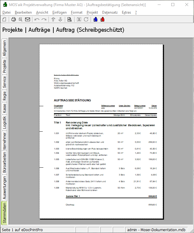 Der Projektvorgang wird im Format des Hauptlayouts dargestellt: Wünschen Sie ein anderes Layout als das Hauptlayout, dann wählen Sie das entsprechende Layout unter . Bei mehrseitigen Projekten gehen Sie mit Strg+Bild Runter ans Ende des Ausdrucks und blättern mit den Tasten Bild Hoch bzw. Bild Runter seitenweise vor und zurück. Mit der linken Maustaste schalten Sie zwischen einer vergrößerten und der 1:1 Darstellung um. Schließen Sie die Seitenansicht mit Esc. Wollen Sie den Projektvorgang ausdrucken, können Sie auf