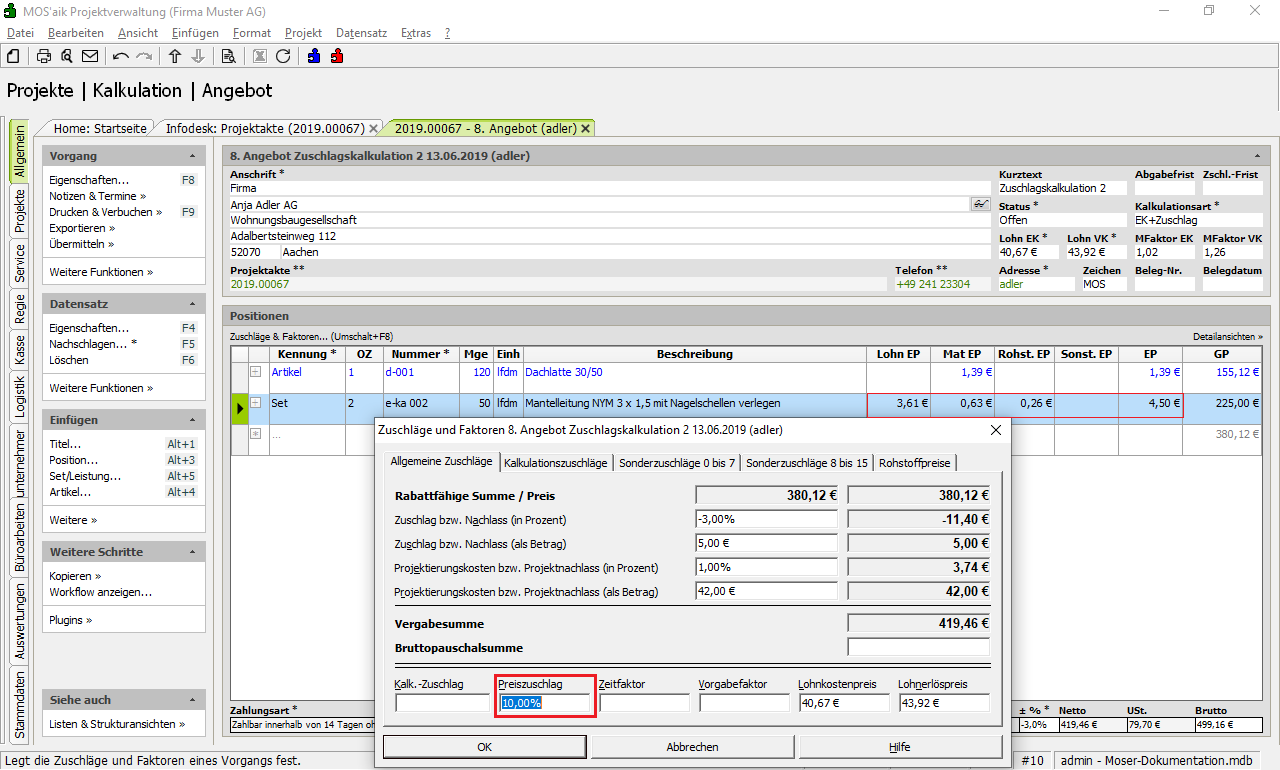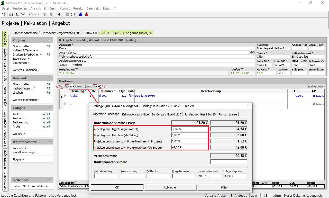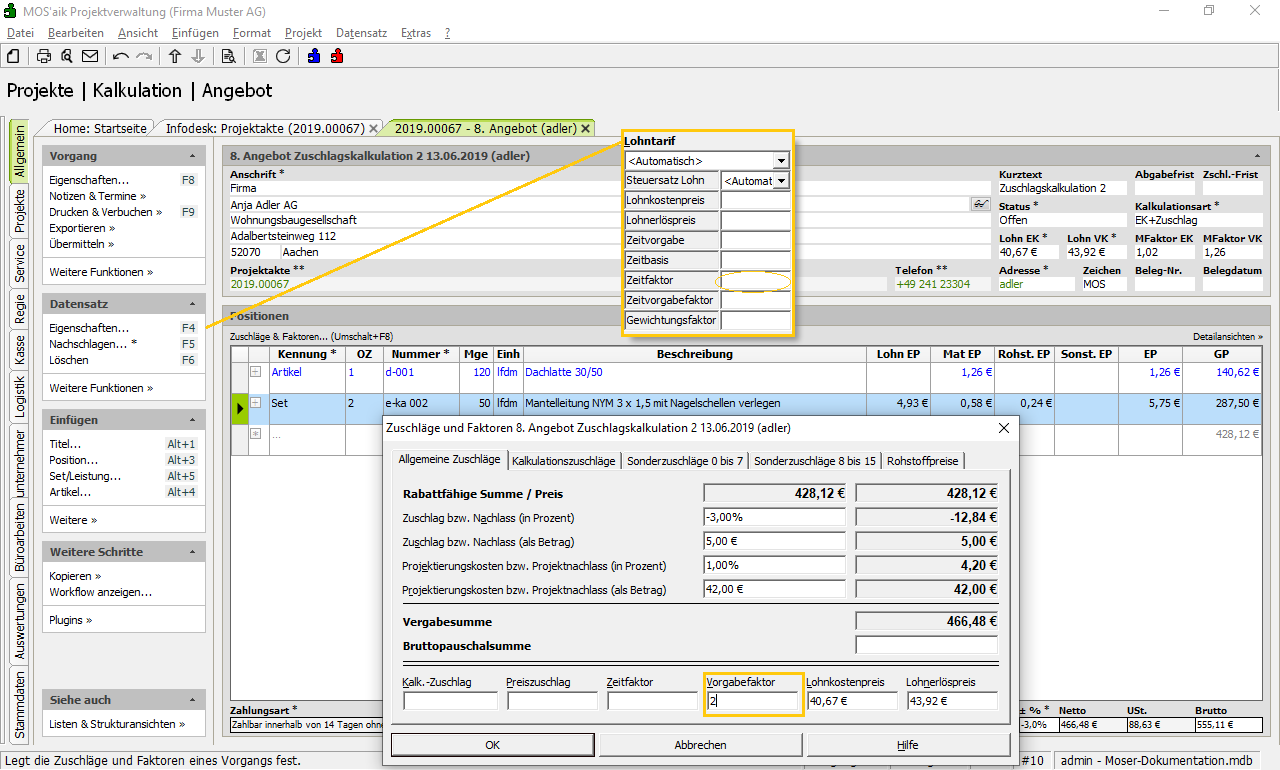 Weiterführende Informationen finden Sie unter Kalkulation - Beispiel: Zuschlagskalkulation sowie unter Handbuch Projektverwaltung - Sonderzuschläge.
