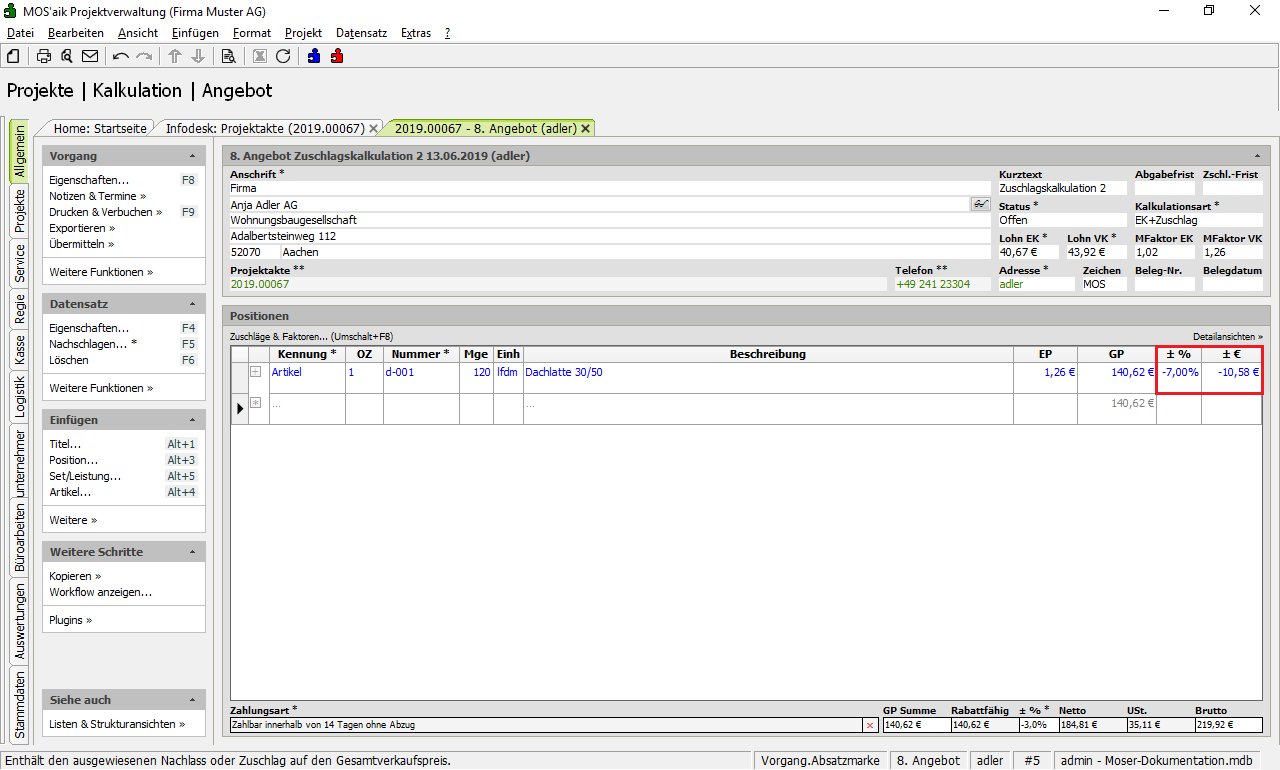 Offene Zu- bzw. Abschläge sowie Projektierungskosten und Projektnachlässe stellen Sie in einem zur Bearbeitung geöffneten Vorgang (z.B. Angebot) über das Symbol