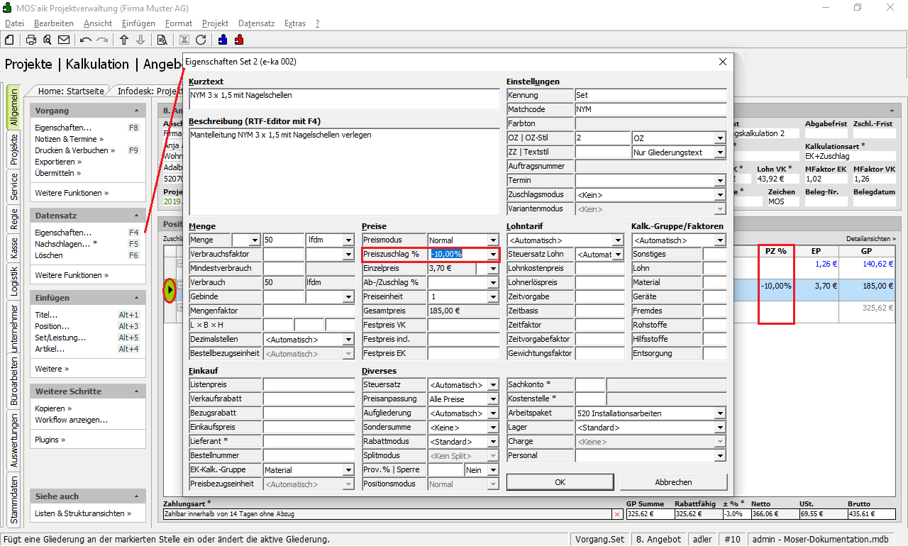 Preiszuschlaghinterlegen oder Sie blenden die SpaltePZ %in der Positionstabelle ein.