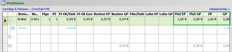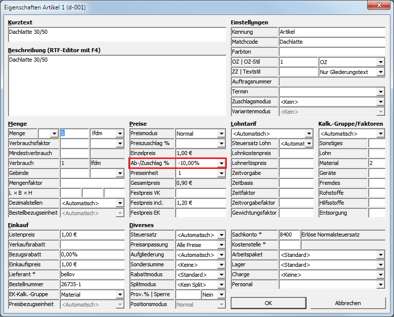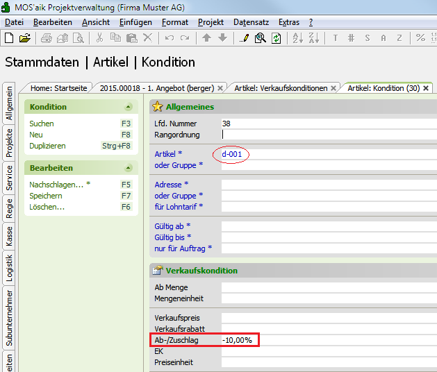 Für den Artikel d-001 wird ein Ab-/Zuschlag von -10% festgelegt und der Artikel in einen Angebotsvorgang eingefügt: