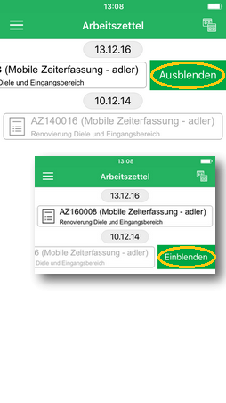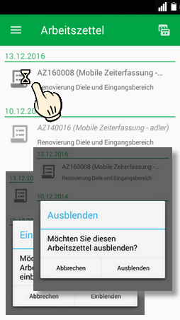Umgekehrt können ausgeblendete Arbeitszettel wieder mit einem langen Fingerdruck eingeblendet werden.