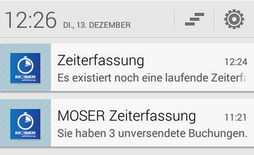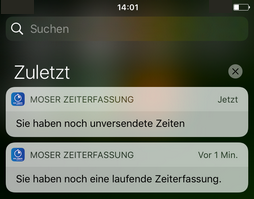 Aktivieren Sie diese Option, um Benachrichtigungen über noch laufende oder für längere Zeit ungesendete Zeiterfassungen zu erhalten. Die Benachrichtigungen erfolgen über die Mitteilungszentrale Ihres Mobilgerätes: