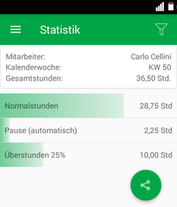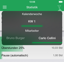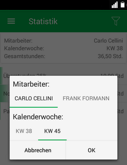Über das Filtersymbol in der rechten oberen Ecke können sie den gewünschten Mitarbeiter und die Kalenderwoche auswählen.