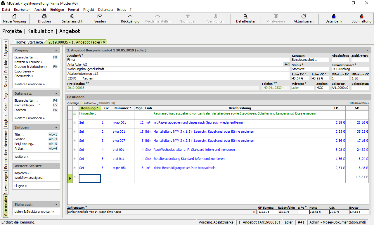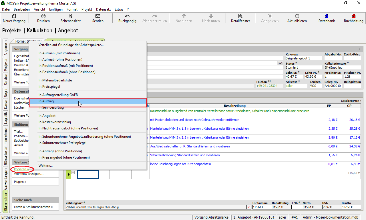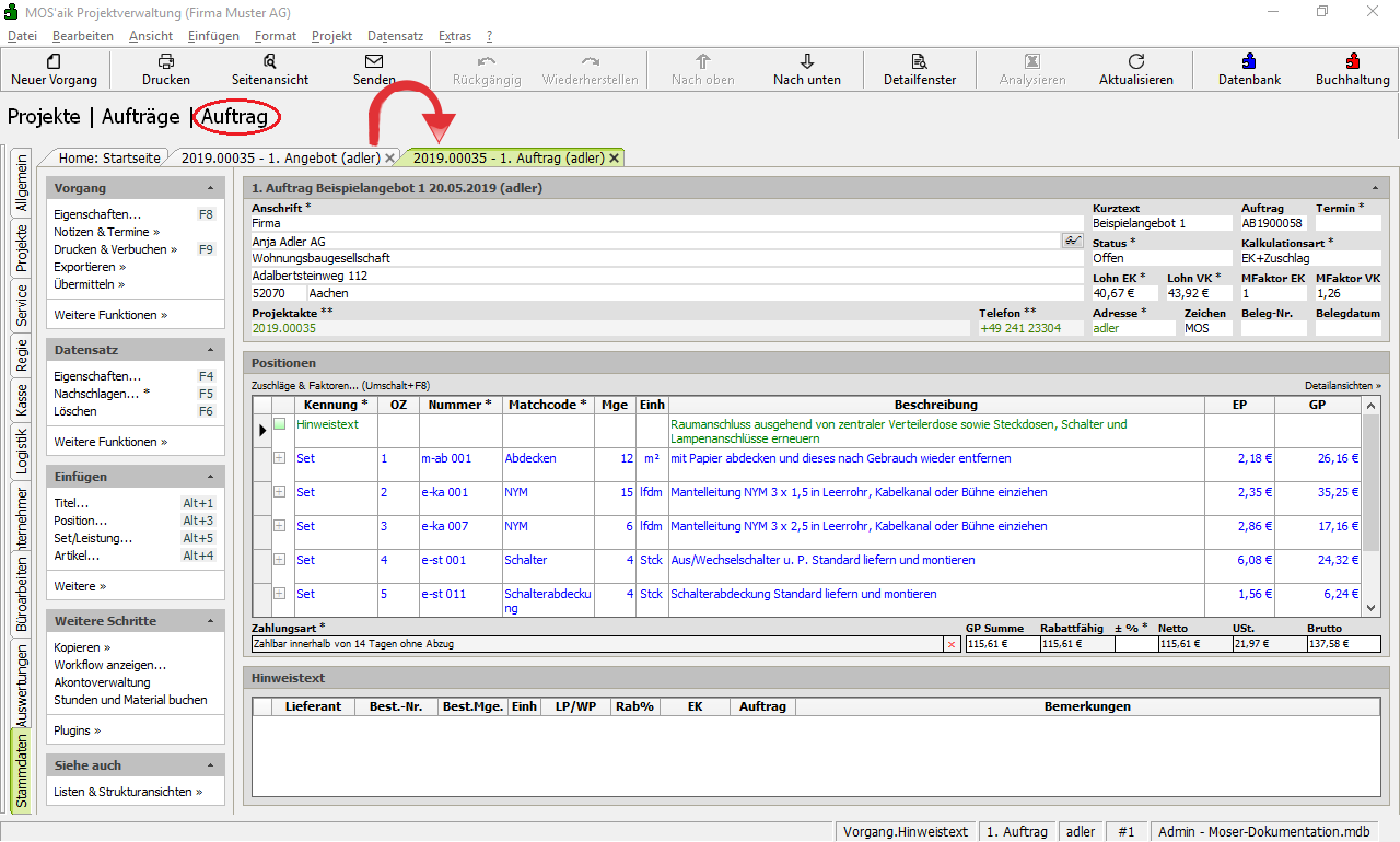 In diesem Schritt erstellen Sie einen Auftrag aus einem bereits bestehenden Angebot: