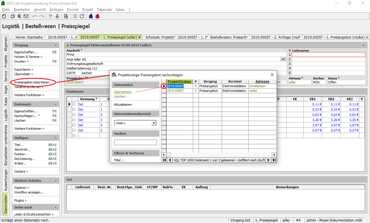 der Liste der verfügbaren Vorgänge. Importieren Sie das Angebot mit