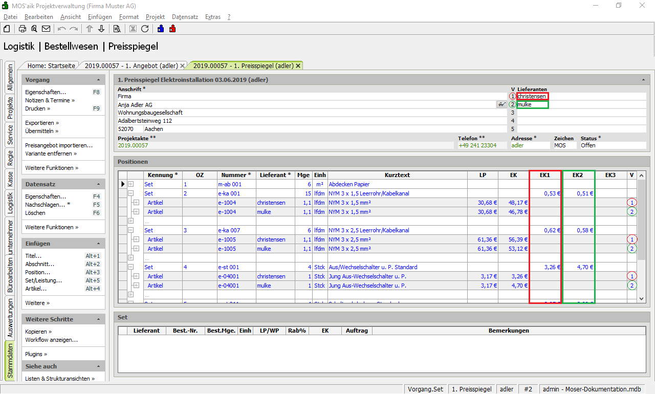 Der fertige Preisspiegel mit zwei Lieferantenangeboten.