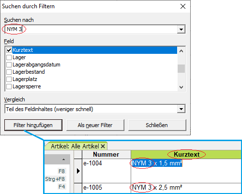 Rufen Sie den Dialog erneut auf und geben Sie nun z.B. den Begriff "wanne" ein und wählen das Feld Kurztext mit der Vorgabe Teil des Feldinhalts aus. Klicken Sie auf die Schaltfläche .