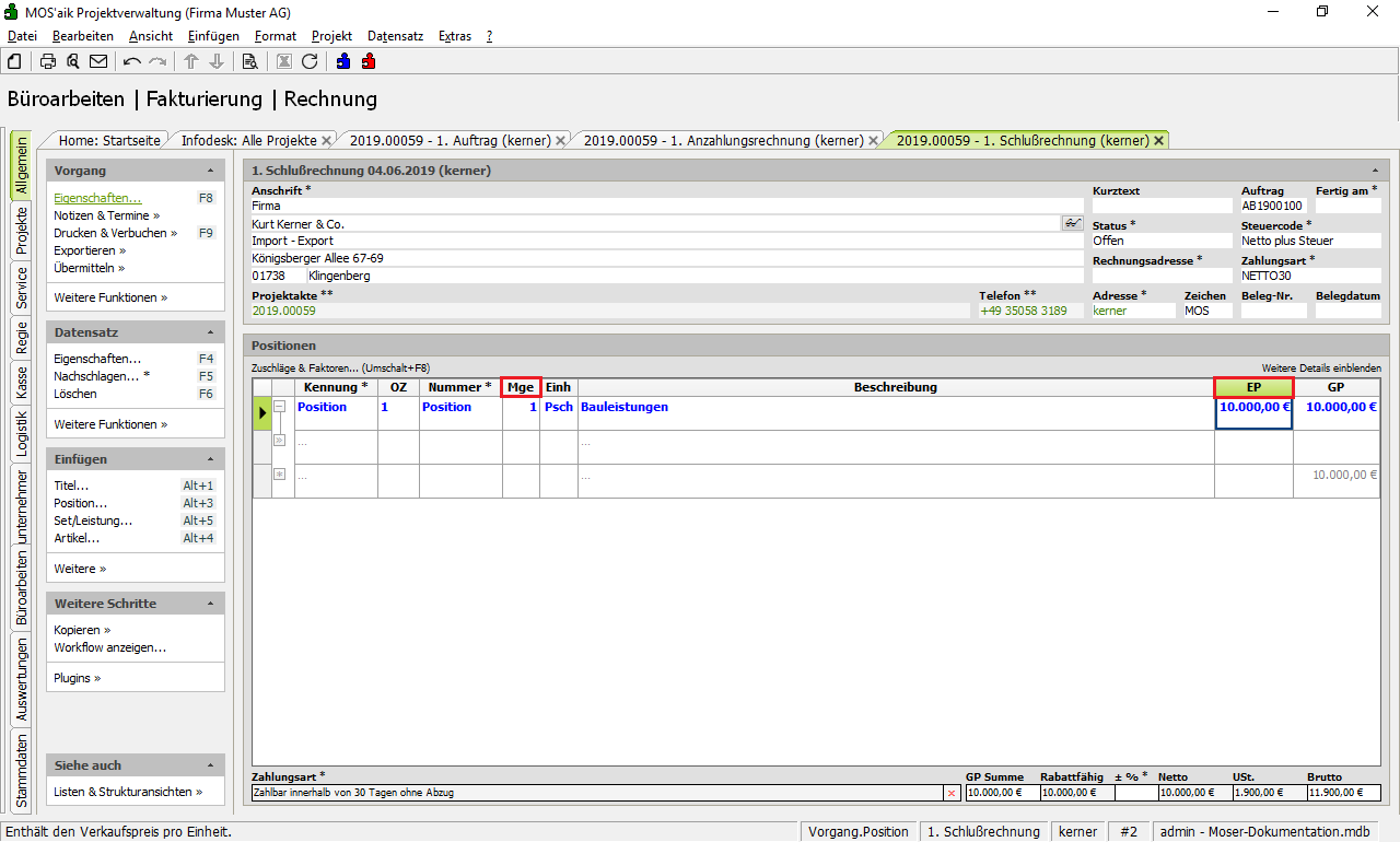 Passen Sie in der Schlussrechnung die Mengen (