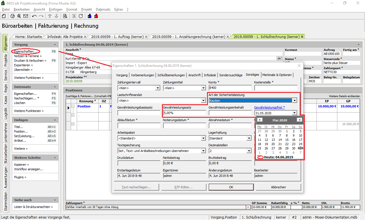 Auf der Registerkarte Sonstiges der Vorgangseigenschaften wählen Sie die Art der Sicherheitsleistung (hier: Kaution) und geben den Gewährleistungssatz (in Prozent) bzw. den Gewährleistungseinbehalt (als Betrag) ein. Die Gewährleistungsfrist endet typischerweise nach 2 Jahren. Stellen Sie das Ablaufdatum ein, indem Sie das Jahr (gelbe Markierung) bzw. Monat (blaue Markierung) und Tag in der Kalenderansicht anklicken und mit den Symbolen