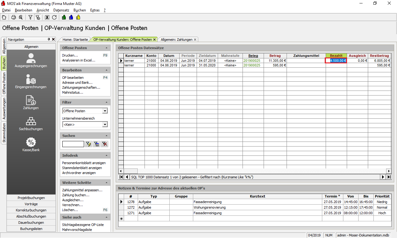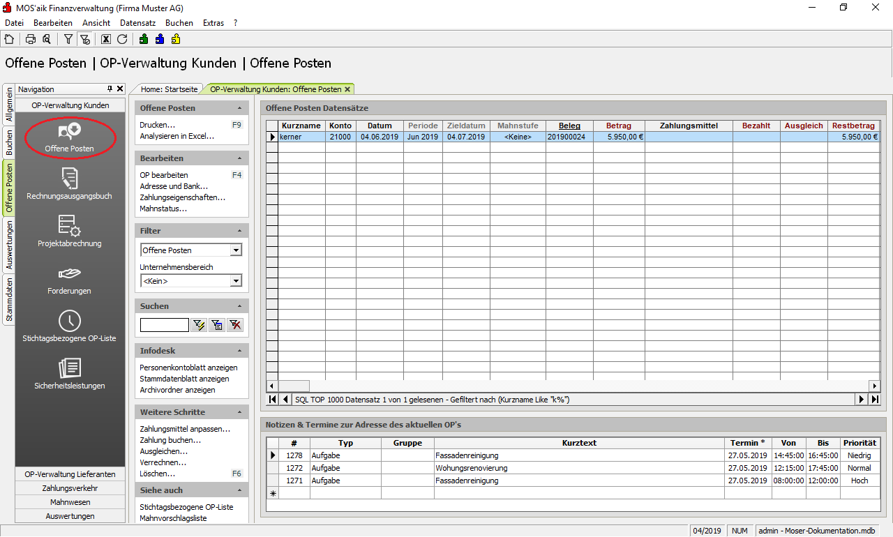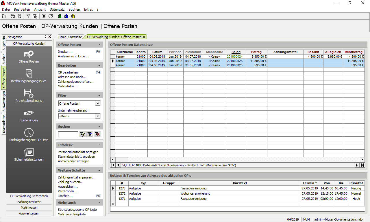 Nach dem Verbuchen des Stapels erscheinen auch die Schlussrechnung sowie die darin erfasste Sicherheitsleistung (Kaution) als Offene Posten im Arbeitsblatt Offene Posten der MOS'aik-Finanzverwaltung
