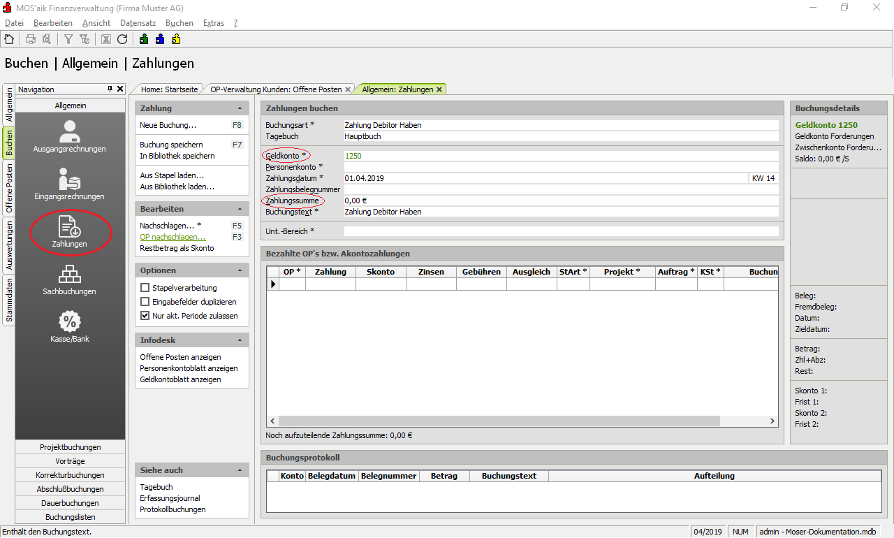 Zum Verrechnen von OPs der Adresse rufen Sie das Arbeitsblatt Buchen | Allgemein | Zahlungen auf. Wählen Sie zunächst im Feld Geldkonto ein Zwischenkonto aus und stellen die Zahlungssumme auf 0,00€ ein.