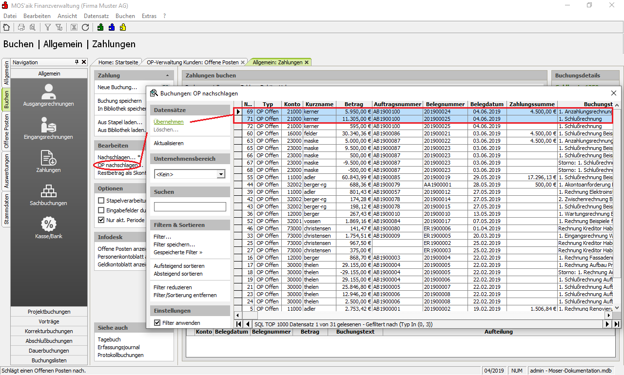 Belegdatummarkieren und über eine Funktion Absteigend sortieren. Klicken Sie die gewünschten OPs bei gedrückter STRG-Taste nacheinander an und rufen Sie die Funktion Datensätze Übernehmen auf.