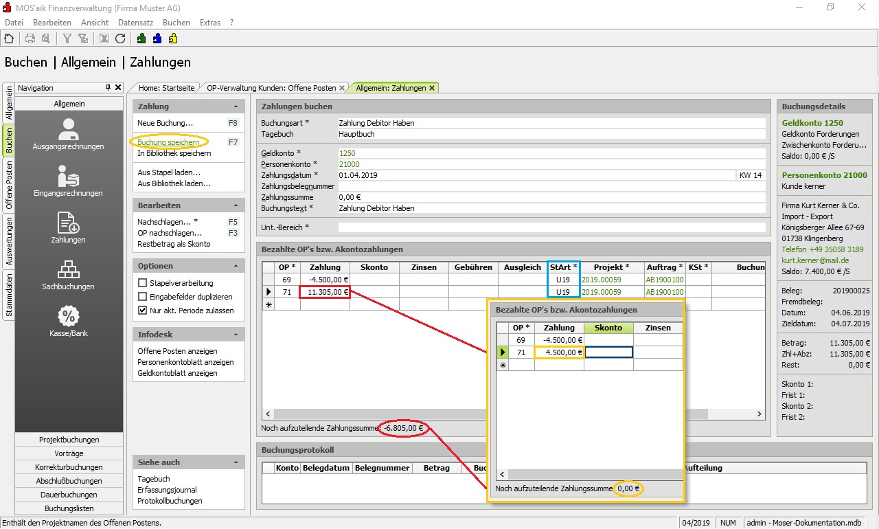 StArt *ausgewählt werden. (blaue Markierung).Prüfen Sie anschließend, dass die Information über die Noch aufzuteilende Zahlungssumme (unterhalb der Tabelle) den Wert 0,00€ aufweist und speichern Sie die Buchung mit Buchung speichern F7.