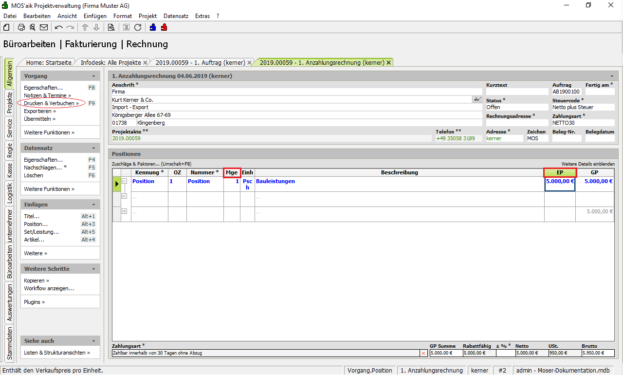 Mgesowie die Preise in der SpalteEPangepasst. Anschließend wird der Vorgang mit der Funktion Drucken & Verbuchen » verbucht.