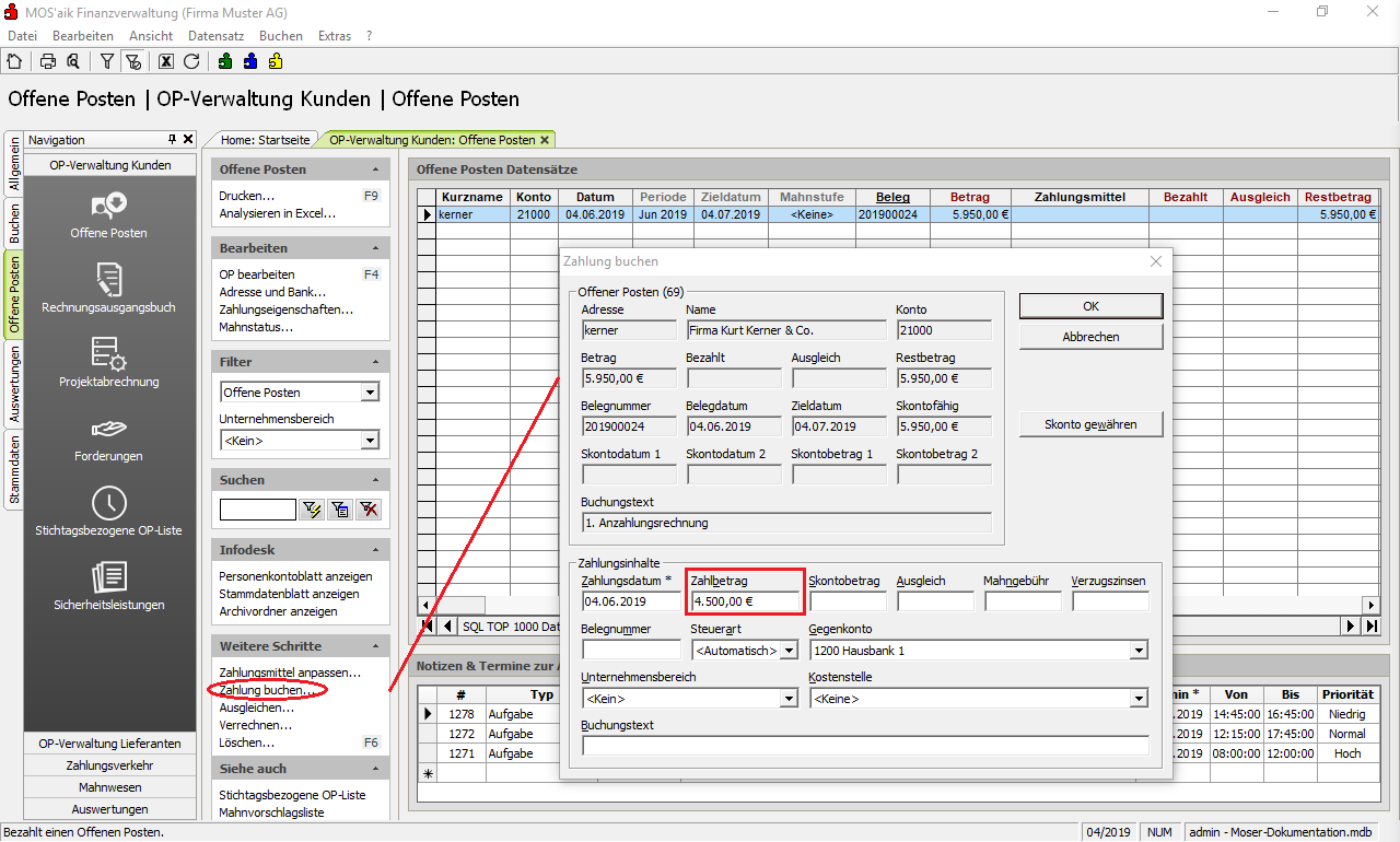 Im Beispiel wird zunächst nur ein Teilbetrag i.H.v. 4.500,00€ auf die Rechnung gezahlt. Die Zahlung wird mit OK gebucht und anschließend in der Spalte
