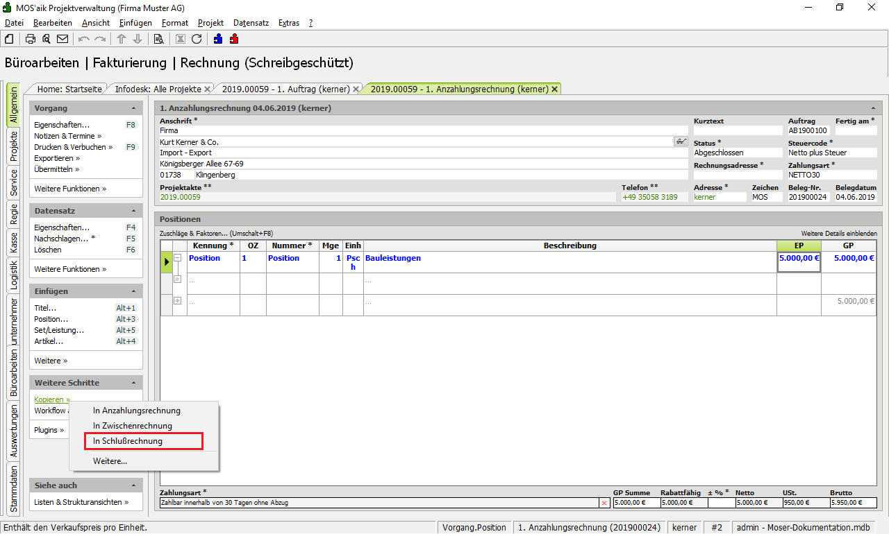Der Auftrag wird über die Funktion Kopieren » in eine Anzahlungsrechnung umgewandelt.