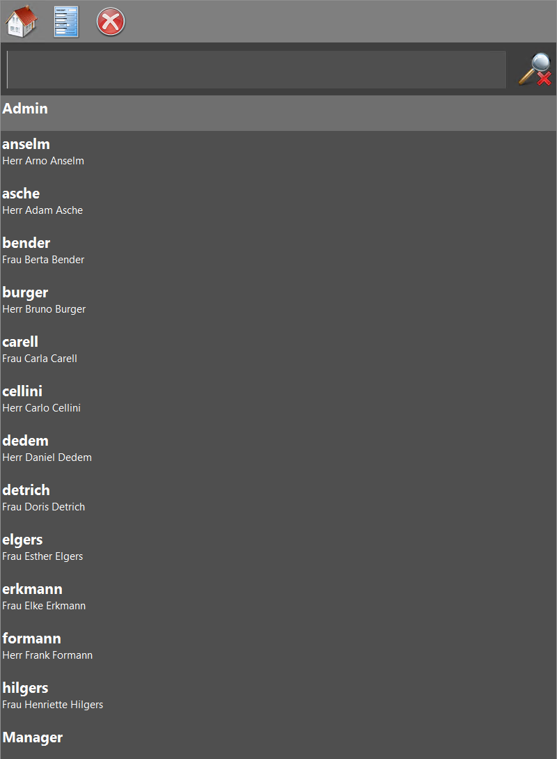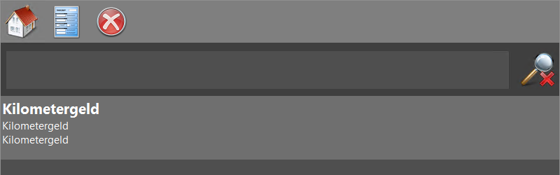 Wählen Sie einen Fahrttarif (Lohnart) durch Antippen aus. Es werden nur die Tarife angezeigt, die Sie in Abschnitt 3.2.3, „Lohnartenstammdaten“ für den mobilen Service ausgewählt haben! Dazu müssen die hier angezeigten Lohnarten mit der Einheit „km“ eingerichtet worden sein. Die Eingabe von Begriffen im Suchfeld reduziert die Liste der angezeigten Ergebnisse schon beim (Vor-) Tippen auf solche, die alle Begriffe im Kurztext der Lohnart enthalten. Mit dem Symbol