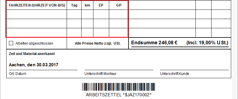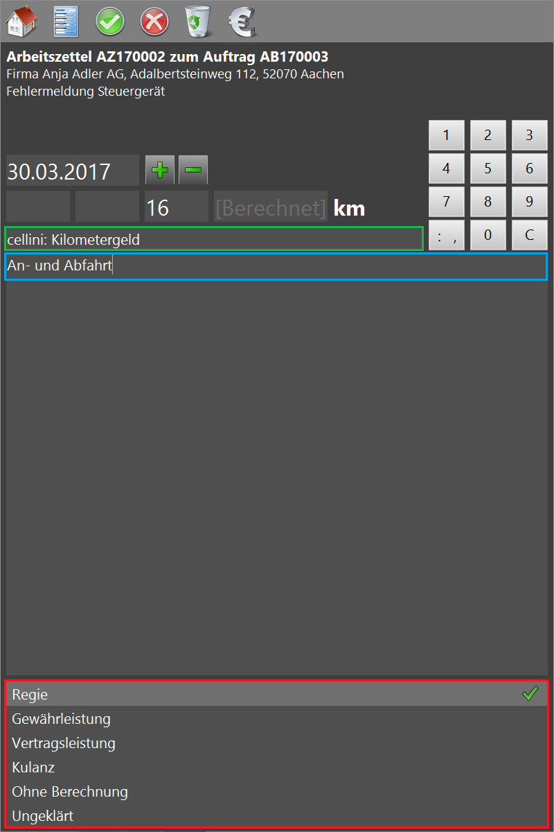 Eingabedialog des Arbeitszettels zum Erfassen der Fahrten (km). Tippen Sie auf