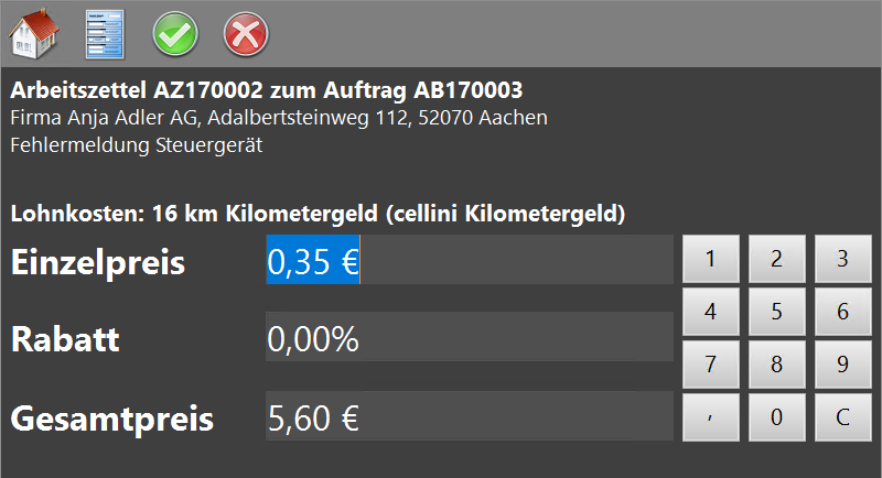 Verwenden Sie den eingeblendeten Ziffernblock zur Eingabe. Die Felder Einzelpreis, Rabatt und Gesamtpreis können auch individuell angepasst werden. Beim Abrechnen von Fahrtkosten (Lohnart-Typ "Wert") werden die Preise nur dann aus den Stammdaten der Lohnart übernommen, wenn die Felder nicht gefüllt sind. |