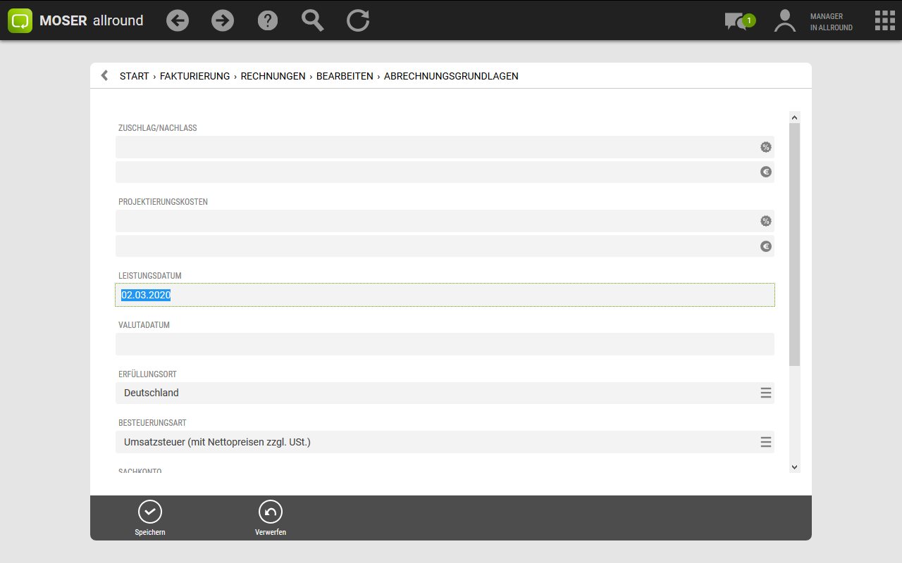 Um ein abweichendes Leistungsdatum anzugeben, legen Sie dieses im Rechnungsvorgang wie folgt fest: