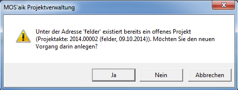 Beim Schließen mit OK erfolgt ggf. eine Rückfrage zur Speicherung des Vorgangs in einer neuen Projektakte oder einer bereits bestehenden Projektakte zur Schadenakte. Bei Auswahl von "Ja" wird die betreffende Projektakte der aktuellen Schadenakte zugeordnet. Dies kann u.U. nicht gewünscht sein. Weitere Informationen dazu finden Sie im Kapitel 6, Projektakten und Vorgänge zur Schadenakte.