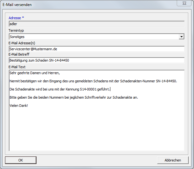 Das Feld wird aus der gewählten Voreinstellung vorbelegt und kann bei Bedarf geändert werden. In den vorgefertigten Texten können auch Platzhalter z.B. für Daten der Schadenakte hinterlegt werden.
