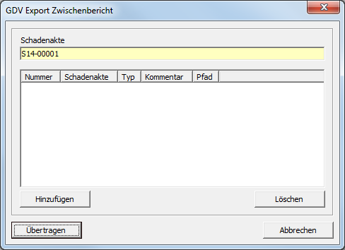 Durch die Auswahl dieser Aktion wird der folgende Dialog angezeigt. Hier können Dokumente für die digitale Übertragung an die Versicherung ausgewählt werden. Mittels wird die Übertragung des Zwischenberichts ausgelöst.