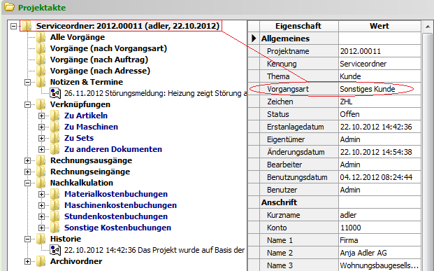 Voraussetzung ist die Berechtigung zum Löschen von Vorgängen für den aktuellen Benutzer und für alle im Projekt vorkommenden Vorgangsarten. Außerdem benötigt der Benutzer die Berechtigung zum Löschen von Vorgängen der Vorgangsart des Projektes (i.A. „Sonstiges Kunde“, siehe Projektakte, Abbildung rechts). Mehr Informationen zum Thema Berechtigungen finden Sie im Dokument Benutzerverwaltung. |