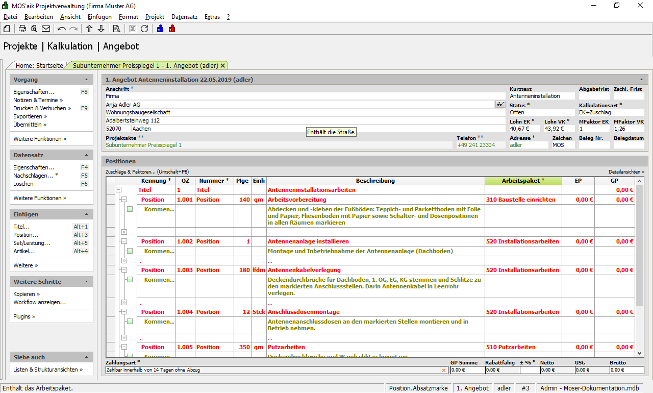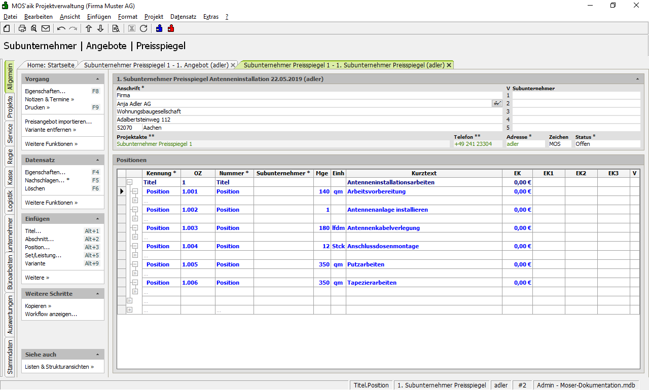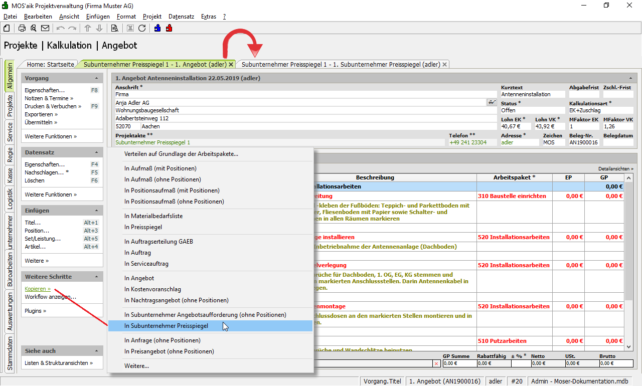 Subunternehmer Preisspiegel können einfach aus kundenseitigen Angeboten und Aufträgen mit Arbeitspaketen sowie auch aus Angeboten ohne Arbeitspakete durch Kopieren erstellt werden.