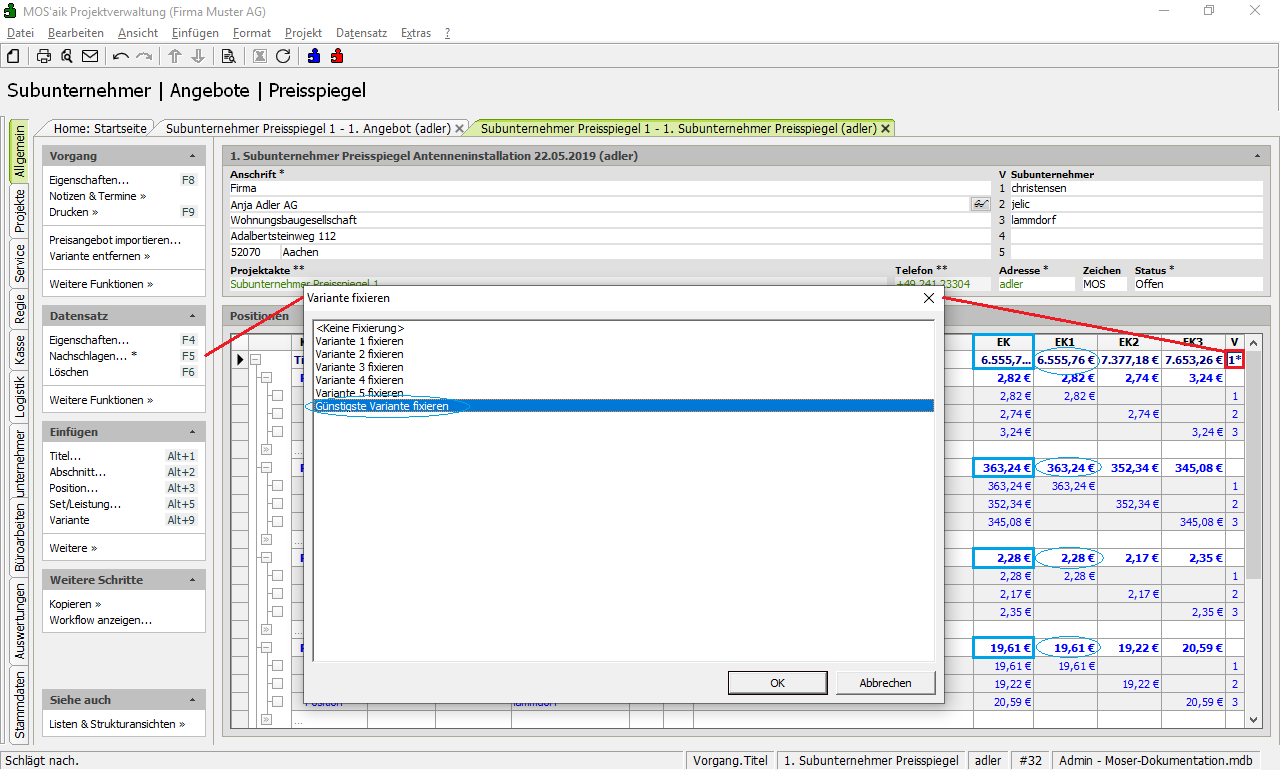 Vvon Positionen oder Titeln durch Eingabe der Variantennummer manuell oder bestimmen Sie diesen automatisch, indem Sie die Zelle markieren und über F5 die Günstigste Variante fixieren. Die fixierte Variante wird mit "*" gekennzeichnet und der resultierende Wert in der SpalteEKangezeigt.