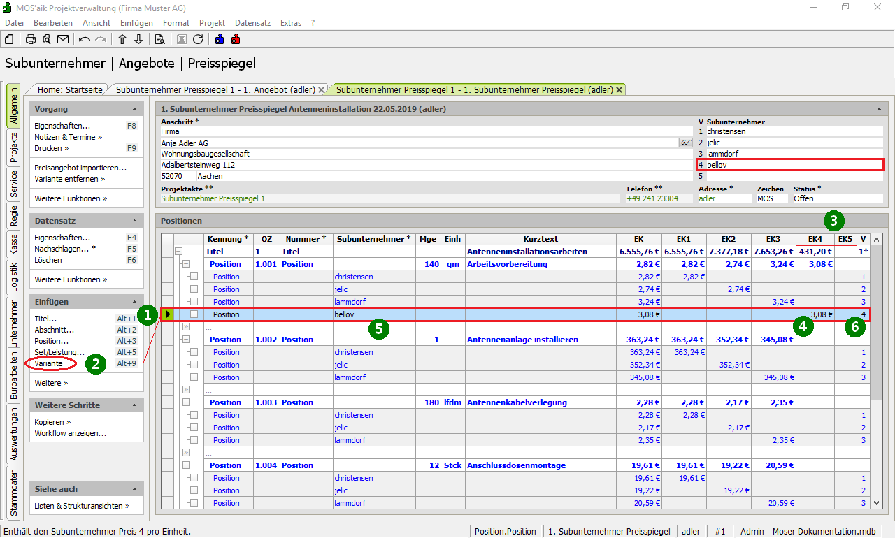 Subunternehmer Preisspiegel stellen eine Möglichkeit zum Vergleich der Konditionen verschiedener Subunternehmer dar und es ist damit möglich die Konditionen (Varianten) von bis zu fünf Bietern (Lieferant bzw. Subunternehmer) übersichtlich zu vergleichen.