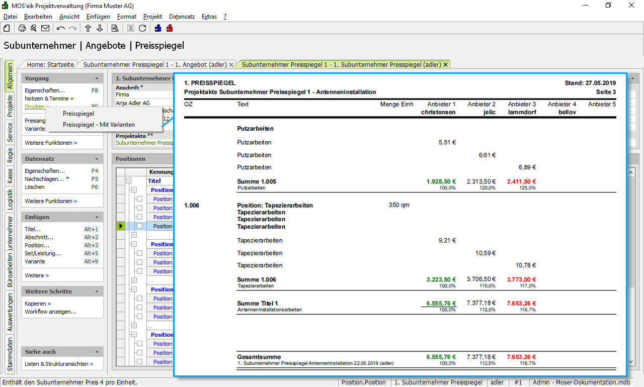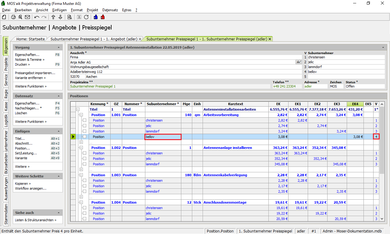 Der erstellte Subunternehmer Preisspiegel (hier für alle Positionen/Arbeitspakete).