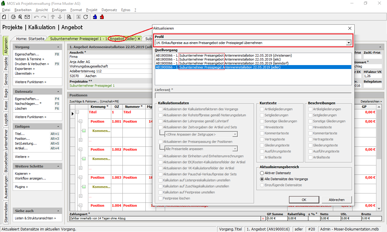 ... aus dem Angebotsvorgang das Menü Projekt > Aktualisieren aufrufen, ...