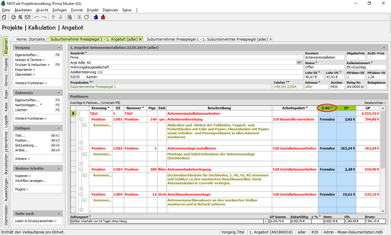 S-KG) übernommen.Beachten Sie, dass im Ausgangsangebot bereits vorhandene Preise in den Gliederungen (Artikel, Sets, ...) ggf. zusätzlich berücksichtigt werden. Positionen mit Festpreis (s. Spalte