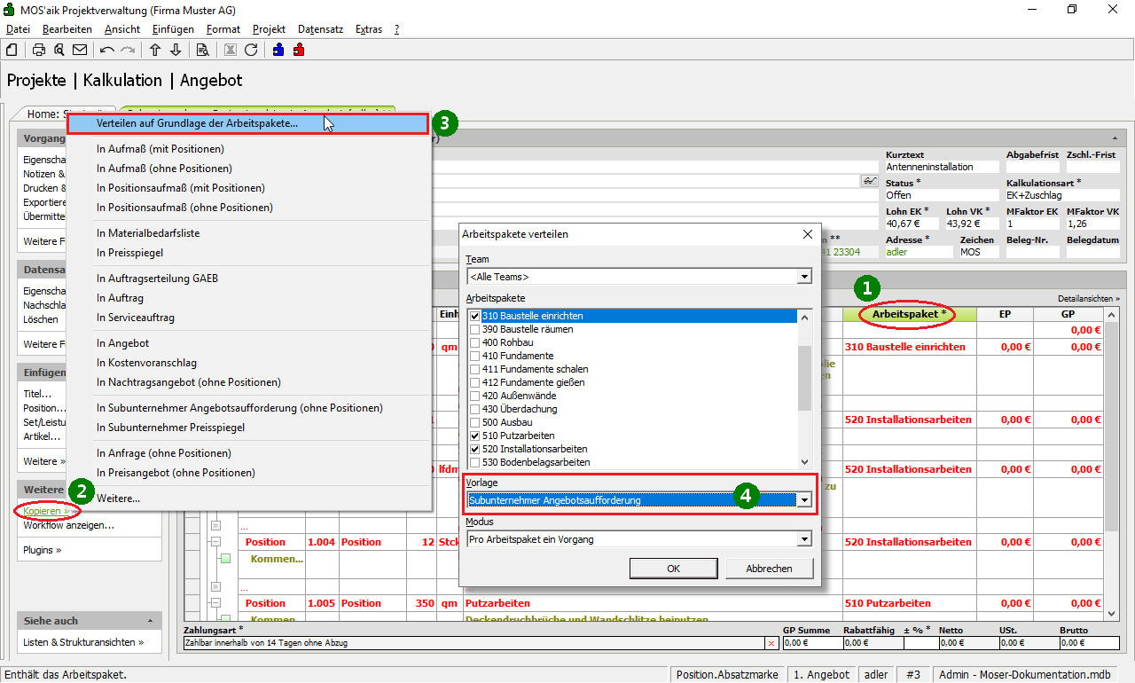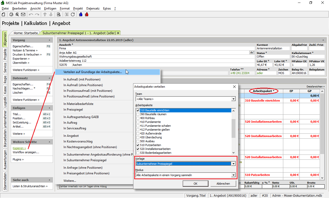 Falls Sie das Modul Arbeitspakete einsetzen, können Sie die Subunternehmer Angebotsaufforderung(en) einfach über Kopieren » Verteilen auf Grundlage der Arbeitspakete ... wahlweise kumuliert oder pro Arbeitspaket erstellen.