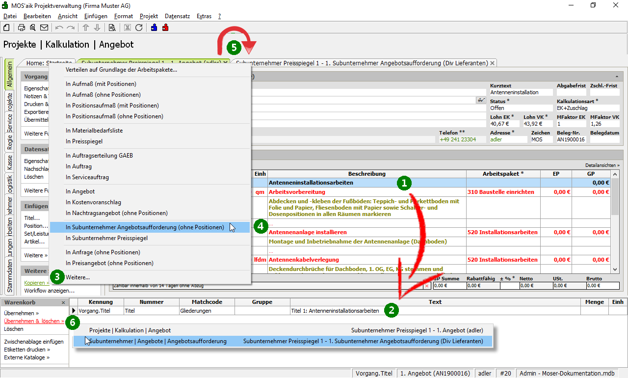 Ohne Arbeitspakete wählen Sie die Funktion Kopieren » In Subunternehmer Angebotsaufforderung (ohne Positionen) 3-4. Um die benötigten Gliederungen in den neuen Vorgang zu übernehmen, markieren Sie diese (z.B. Titel 1) und kopieren die Daten mit F12 in den Warenkorb 2. Wechseln Sie nun in die neue Subunternehmer Angebotsaufforderung 5 und fügen die Gliederungen mit Übernehmen & löschen ein 6. Einen folgenden Dialog zum Aktualisieren können Sie ggf. einfach Schließen.
