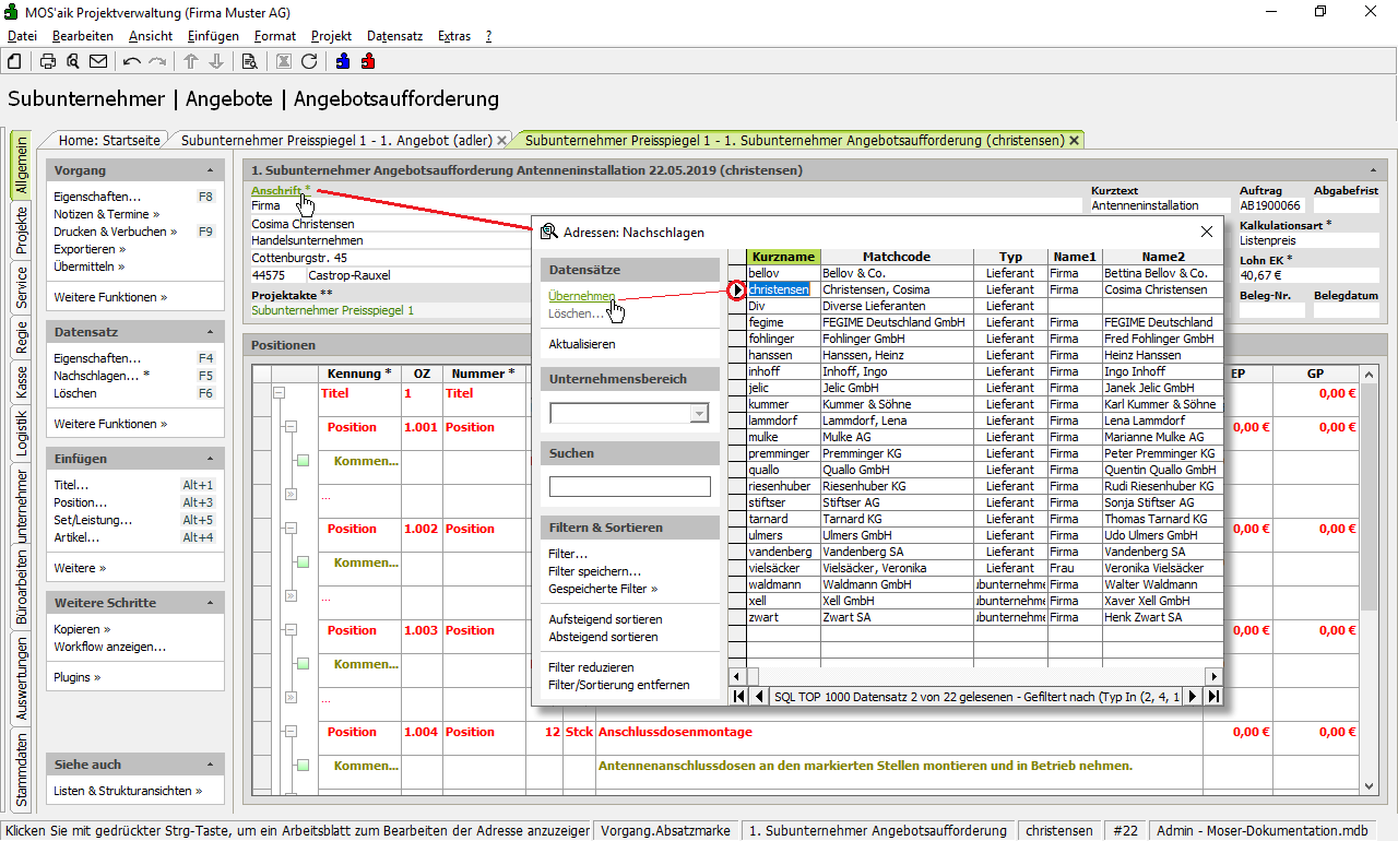 OZ) sowie direkt unter dieser liegende Gliederungen übernommen.Wählen Sie die Adresse Ihres Subunternehmers, indem Sie auf Anschrift klicken, eine Adresse auswählen und Übernehmen.