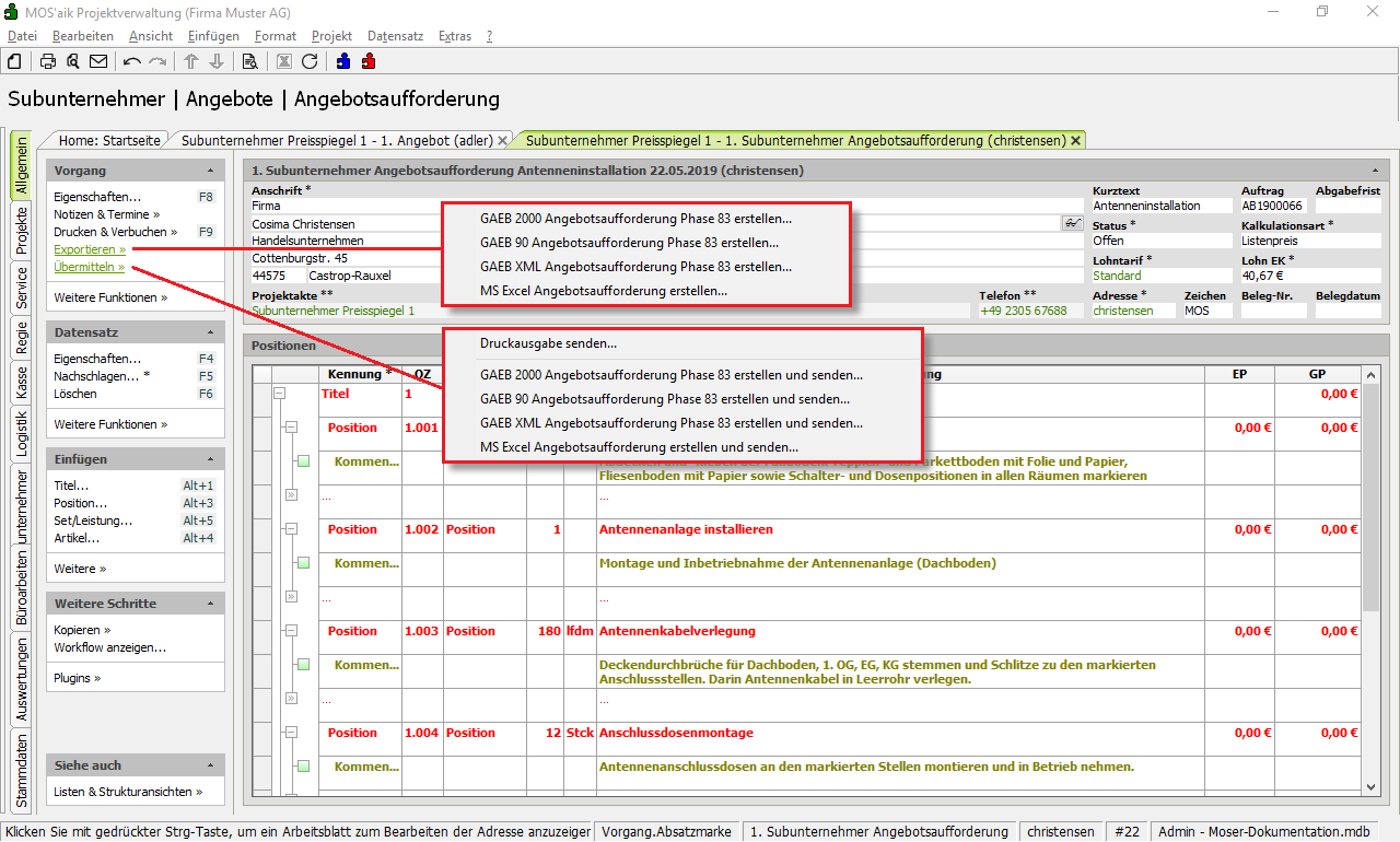 Die Subunternehmer Angebotsaufforderung kann nun als Druckausgabe, im Excel®- oder im GAEB-Format exportiert oder direkt per E-Mail übermittelt werden. Senden Sie diese an den Unternehmer und warten Sie auf dessen Preisangebot ...