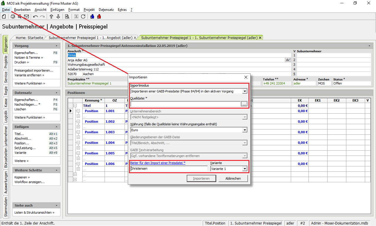 Sobald Sie ein Preisangebot im GAEB-Format [84/94] von Ihrem Subunternehmer (Bieter) erhalten, können Sie dieses über das Menü Datei > Importieren als Variante in den Preisspiegel einfügen. Wählen Sie dazu den Importmodus, die Quelldatei, den Bieter für den Import einer Preisdatei und die Variante (1 ... 5) aus.