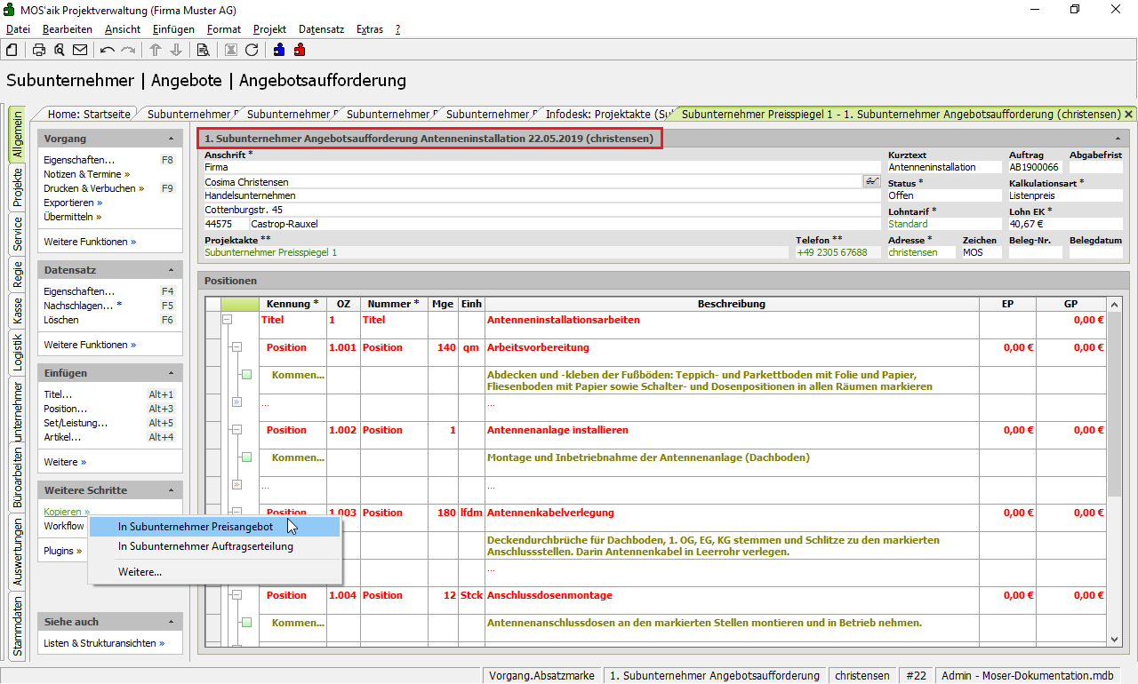 Um dieses für ein Preisangebot an Ihren Subunternehmer weiterzuleiten, benötigen Sie zunächst eine Subunternehmer Angebotsaufforderung. Diese wird im folgenden Schritt erstellt ...