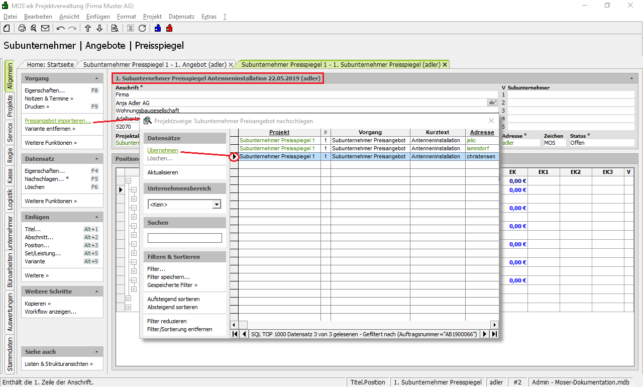 Nachdem Sie sich für einen Subunternehmer entschieden haben, können Sie dessen Preisangebot oder die im Preisspiegel spezifizierte Variante in Ihr Kundenangebot übernehmen, indem Sie ...
