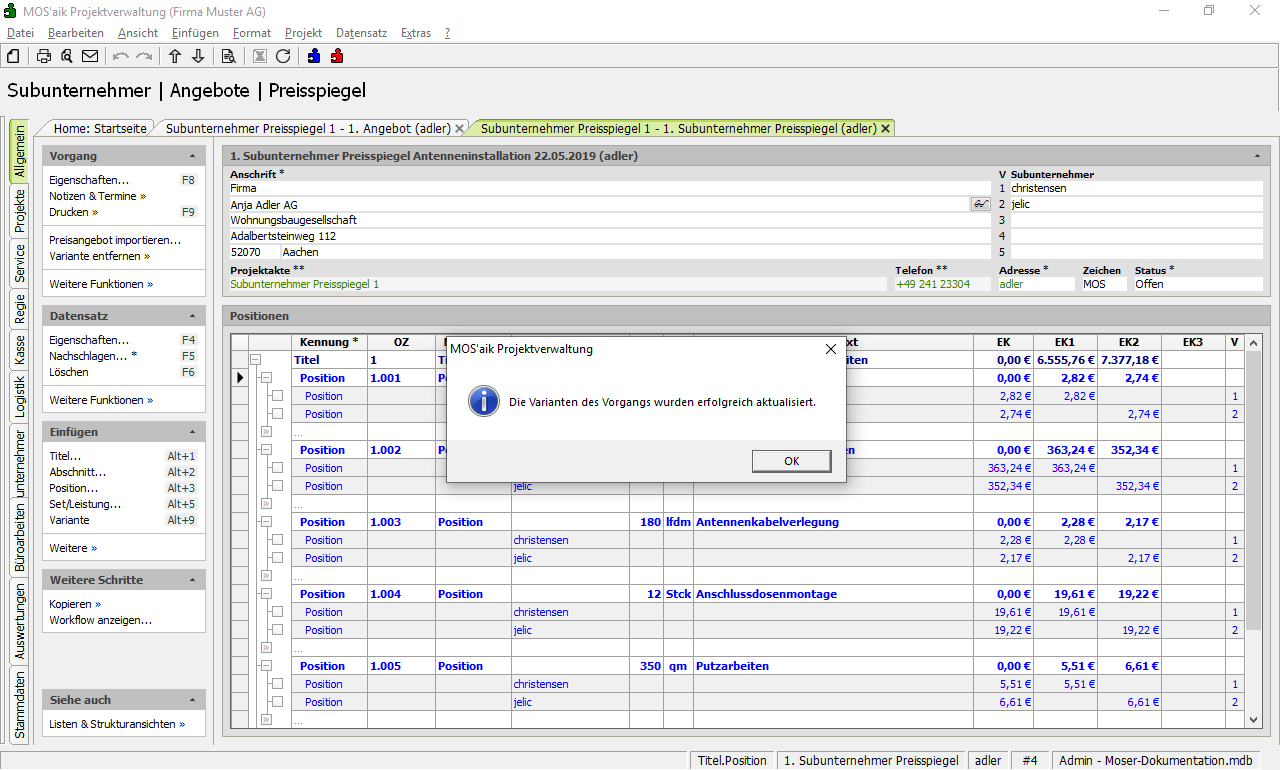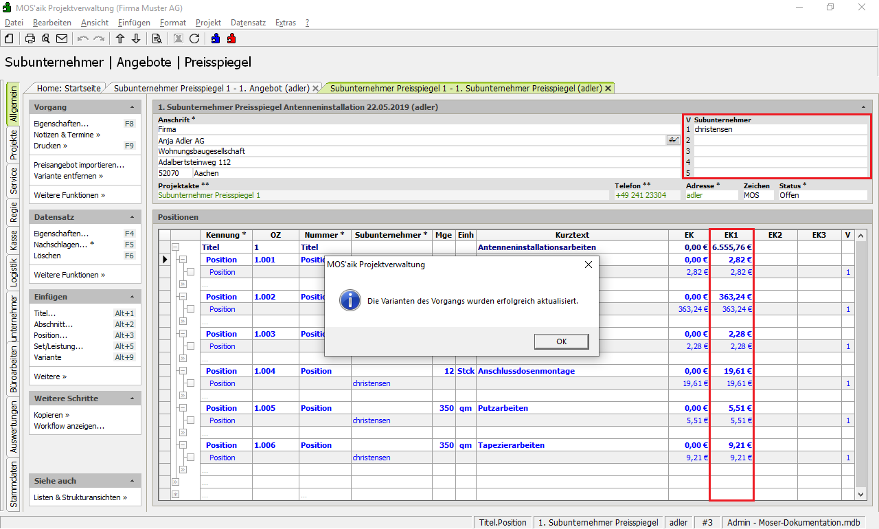Der Import wird mit einer Bestätigungsmeldung abgeschlossen und der Bieter (hier: christensen) wird als neue Subunternehmer Variante aufgeführt. Die Bieterkonditionen zur Variante 1 finden Sie in der Spalte