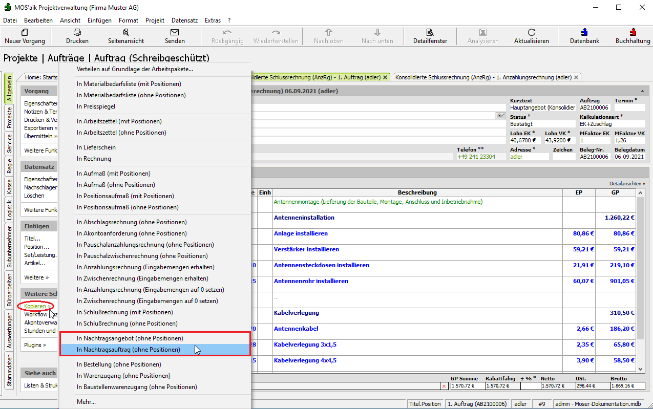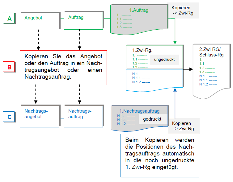Vor dem Drucken der 1. Zwischenrechnung erstellen Sie aus dem Angebot oder Auftrag ein ⇨Nachtragsangebot und erfassen die Nachtragspositionen. Kopieren Sie den Nachtragsauftrag in eine ⇨Zwischenrechnung.