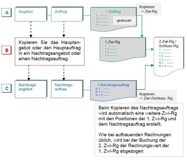 Bei einem (Haupt-)Auftrag mit aufbauenden Anzahlungs- oder Zwischenrechnungen, werden Nachtragsaufträge automatisch in die aufbauenden Rechnungen des (Haupt-)Auftrags und in die gemeinsame Schlussrechnung übernommen.