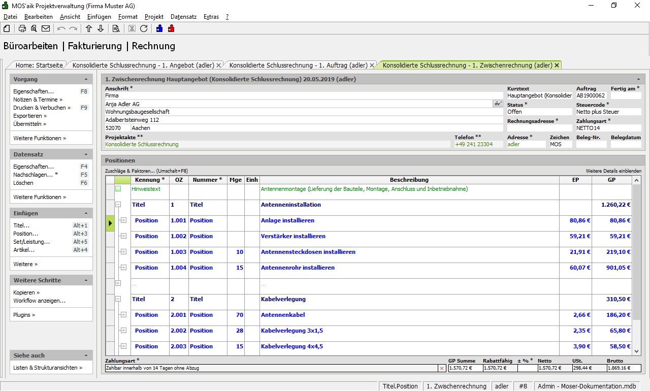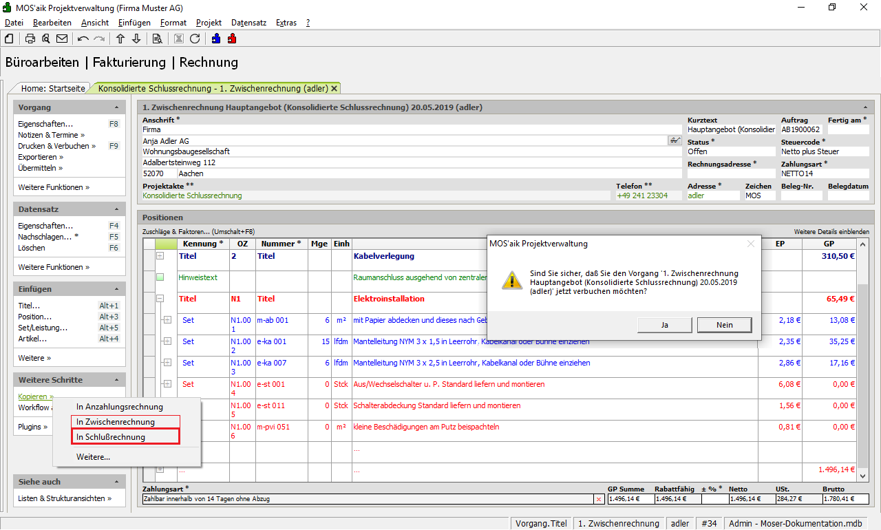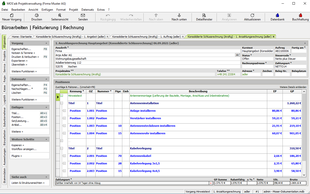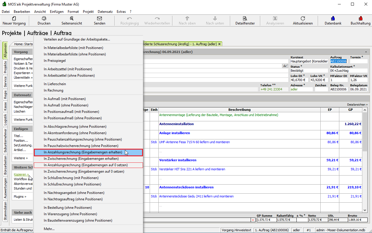 Erstellen Sie aus einem Angebot einen ⇨Auftrag und daraus die ⇨1. Zwischenrechnung.